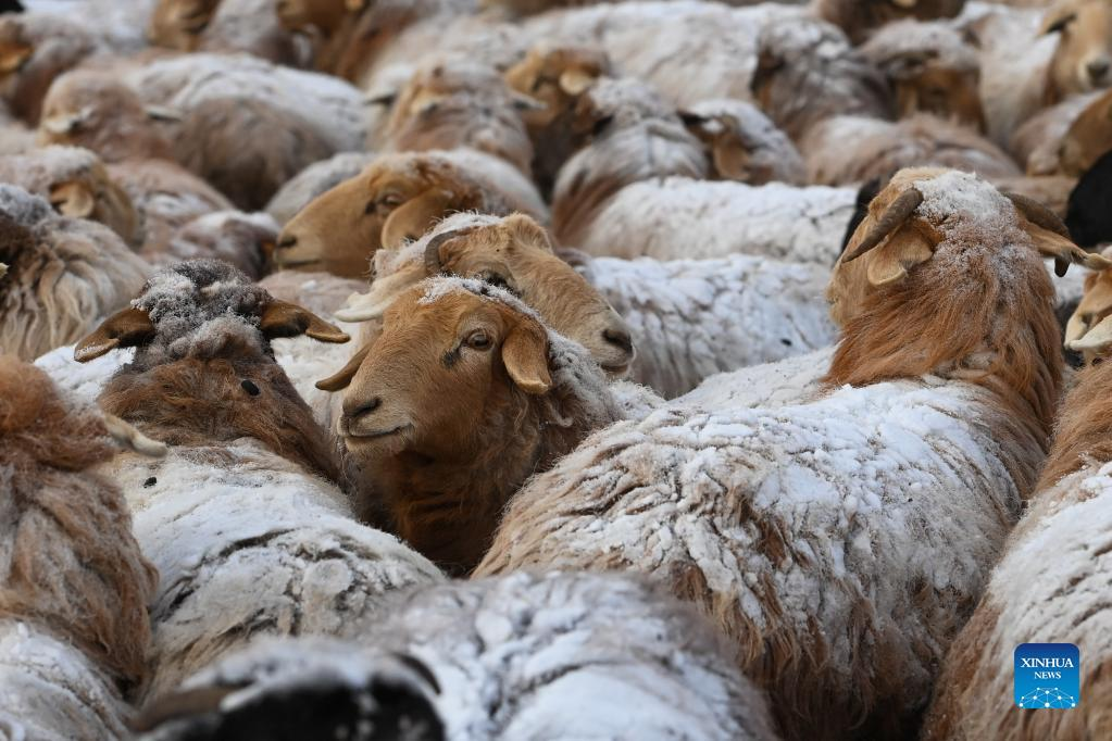 Photo taken on Jan. 24, 2022 shows sheep in Akyaz Valley in Zhaosu County, Kazak Autonomous Prefecture of Ili, northwest China's Xinjiang Uygur Autonomous Region. Akyaz Valley is an important winter pasture for herdsmen in Zhaosu. Every year, herdsmen would migrate along the Akyaz River, driving over 500,000 cattle with them to settle in the valley for the winter. With an average altitude of 3,000 meters, the Akyaz Valley has abundant grass, water and a warmer climate, thanks to the surrounding mountains which block the cold winds. In recent years, while protecting the nomadic tradition, the local government has tried to improve the living conditions in the valley by upgrading the roads, building new communication facilities, installing photovoltaic generators for herdsmen's houses, and constructing animal husbandry hospitals. (Xinhua/Li Zhihao)