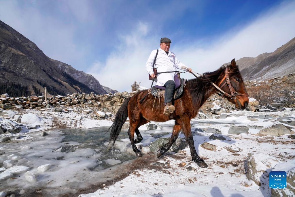 A veterinarian makes a round of visits in Akyaz Valley in Zhaosu County, Kazak Autonomous Prefecture of Ili, northwest China's Xinjiang Uygur Autonomous Region, Jan. 25, 2022. Akyaz Valley is an important winter pasture for herdsmen in Zhaosu. Every year, herdsmen would migrate along the Akyaz River, driving over 500,000 cattle with them to settle in the valley for the winter. With an average altitude of 3,000 meters, the Akyaz Valley has abundant grass, water and a warmer climate, thanks to the surrounding mountains which block the cold winds. In recent years, while protecting the nomadic tradition, the local government has tried to improve the living conditions in the valley by upgrading the roads, building new communication facilities, installing photovoltaic generators for herdsmen's houses, and constructing animal husbandry hospitals. (Xinhua/Zhao Ge)