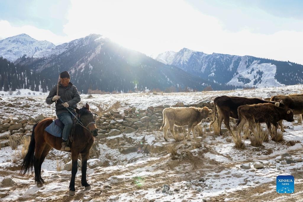 A herdsman rides on a horse in Akyaz Valley in Zhaosu County, Kazak Autonomous Prefecture of Ili, northwest China's Xinjiang Uygur Autonomous Region, Jan. 26, 2022. Akyaz Valley is an important winter pasture for herdsmen in Zhaosu. Every year, herdsmen would migrate along the Akyaz River, driving over 500,000 cattle with them to settle in the valley for the winter. With an average altitude of 3,000 meters, the Akyaz Valley has abundant grass, water and a warmer climate, thanks to the surrounding mountains which block the cold winds. In recent years, while protecting the nomadic tradition, the local government has tried to improve the living conditions in the valley by upgrading the roads, building new communication facilities, installing photovoltaic generators for herdsmen's houses, and constructing animal husbandry hospitals. (Xinhua/Li Zhihao)