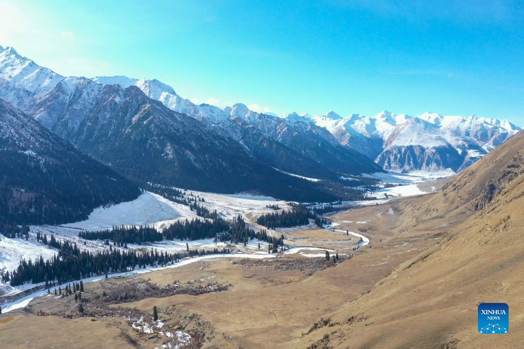Aerial photo taken on Jan. 25, 2022 shows the Akyaz Valley in Zhaosu County, Kazak Autonomous Prefecture of Ili, northwest China's Xinjiang Uygur Autonomous Region. Akyaz Valley is an important winter pasture for herdsmen in Zhaosu. Every year, herdsmen would migrate along the Akyaz River, driving over 500,000 cattle with them to settle in the valley for the winter. With an average altitude of 3,000 meters, the Akyaz Valley has abundant grass, water and a warmer climate, thanks to the surrounding mountains which block the cold winds. In recent years, while protecting the nomadic tradition, the local government has tried to improve the living conditions in the valley by upgrading the roads, building new communication facilities, installing photovoltaic generators for herdsmen's houses, and constructing animal husbandry hospitals. (Xinhua/Ding Lei)
