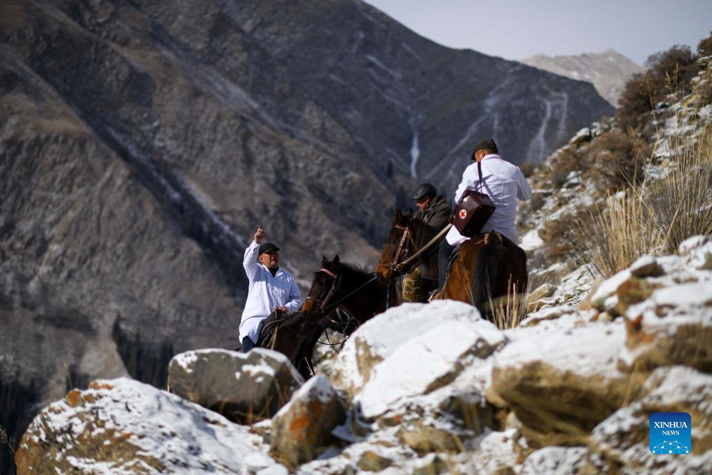 Veterinarians make a round of visits in Akyaz Valley in Zhaosu County, Kazak Autonomous Prefecture of Ili, northwest China's Xinjiang Uygur Autonomous Region, Jan. 25, 2022. Akyaz Valley is an important winter pasture for herdsmen in Zhaosu. Every year, herdsmen would migrate along the Akyaz River, driving over 500,000 cattle with them to settle in the valley for the winter. With an average altitude of 3,000 meters, the Akyaz Valley has abundant grass, water and a warmer climate, thanks to the surrounding mountains which block the cold winds. In recent years, while protecting the nomadic tradition, the local government has tried to improve the living conditions in the valley by upgrading the roads, building new communication facilities, installing photovoltaic generators for herdsmen's houses, and constructing animal husbandry hospitals. (Xinhua/Ding Lei)