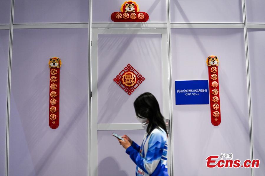 Spring Festival couplets are pasted at the Main Media Center for the 2022 Olympic and Paralympic Winter Games in Beijing, capital of China, Jan.28, 2022. (Photo: China News Service/He Penglei)