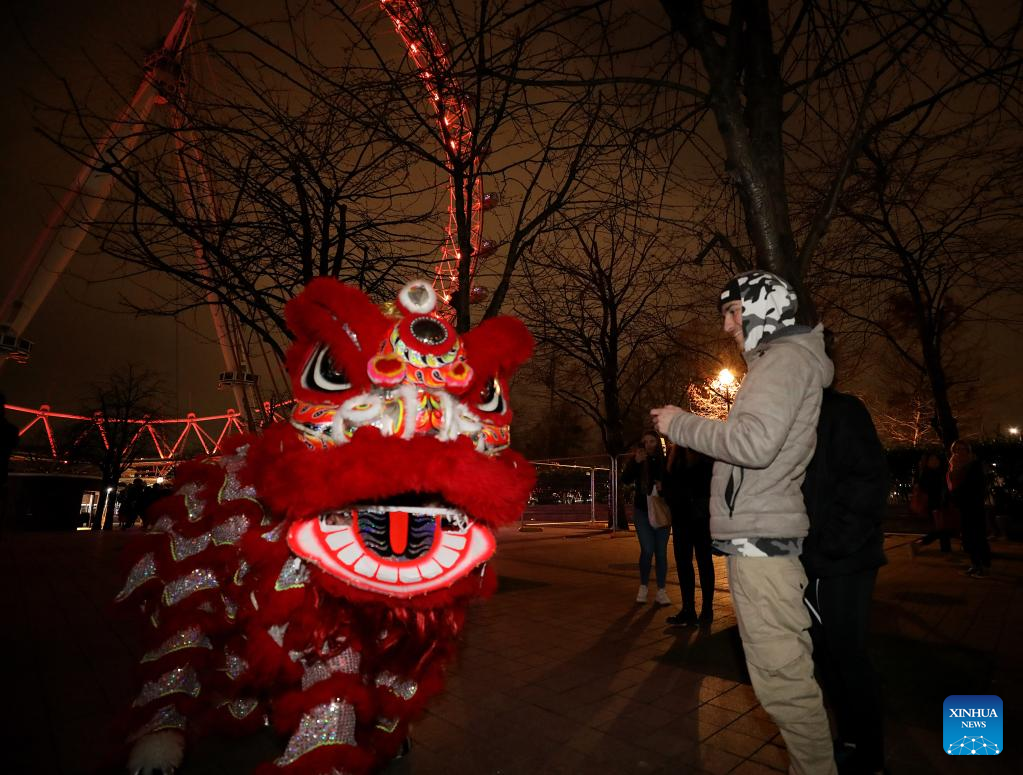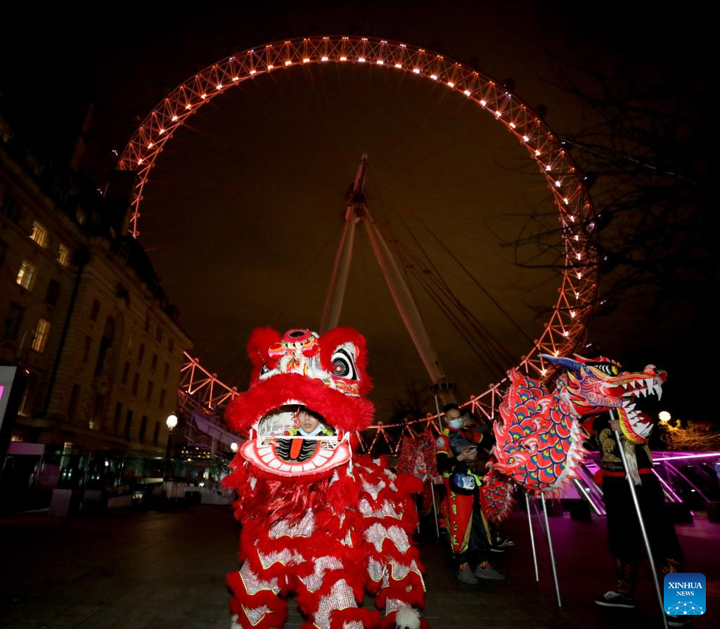 Traditional Chinese lion dancers perform in front of the London Eye which is lit up in red to celebrate the upcoming Chinese New Year in London, Britain, on Jan. 28, 2022. (Xinhua/Li Ying)