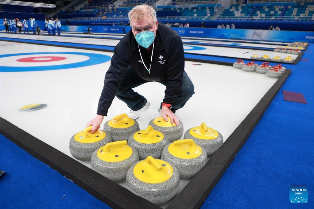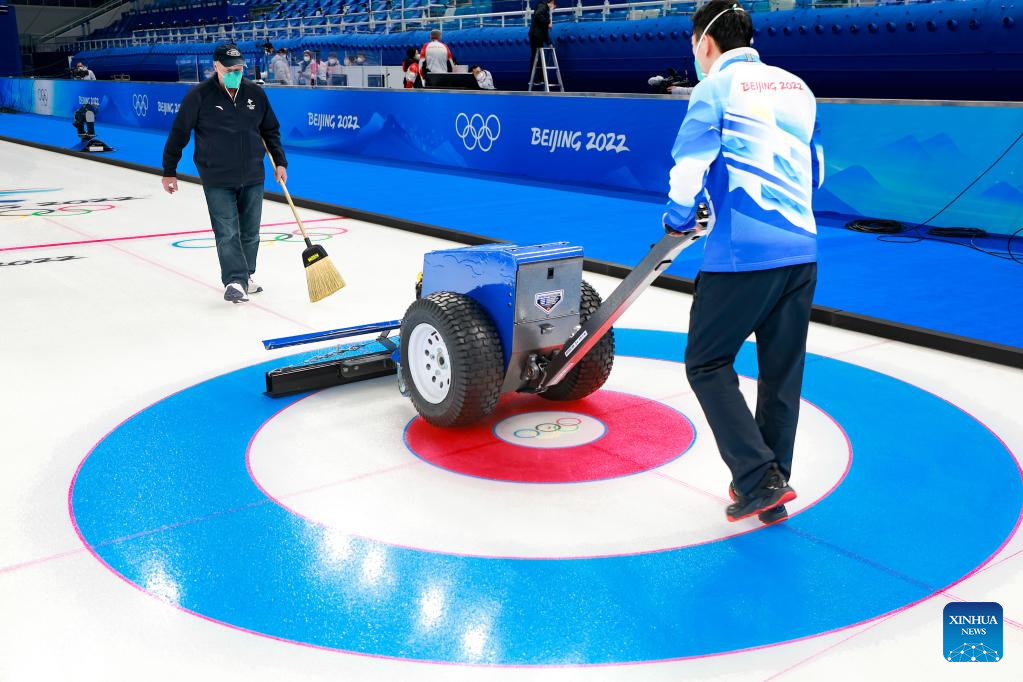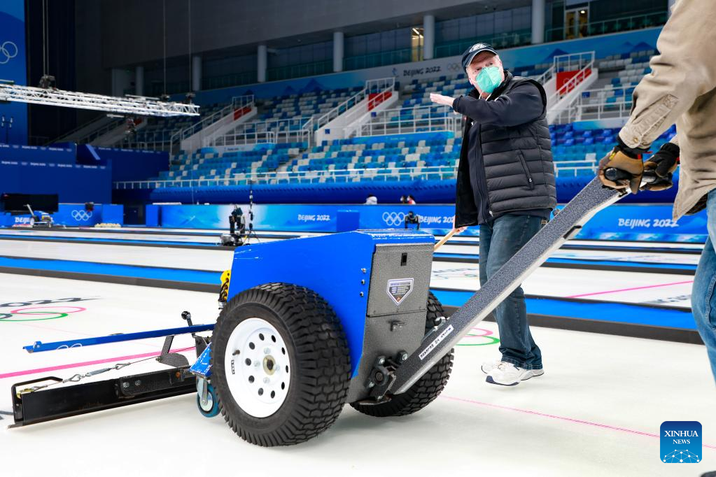 Hans Wuthrich adjusts ice-making facilities at the National Aquatics Center in Beijng, capital of China, Jan. 28, 2022. Hans Wuthrich, a Canadian professional ice technician of World Curling Federation, has been working for world-class curling competitions for years. This is the fourth Olympics for Wuthrich to work as a chief ice technician, responsible for ice-making work of four curling lanes in China's National Aquatics Center, also known as the Ice Cube. (Xinhua/Liu Xu)