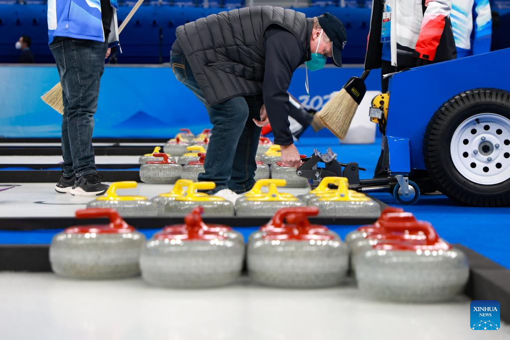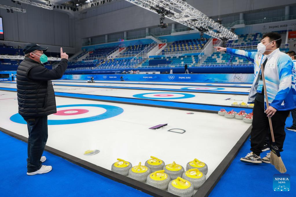 Hans Wuthrich instructs ice-making work at the National Aquatics Center in Beijng, capital of China, Jan. 28, 2022. Hans Wuthrich, a Canadian professional ice technician of World Curling Federation, has been working for world-class curling competitions for years. This is the fourth Olympics for Wuthrich to work as a chief ice technician, responsible for ice-making work of four curling lanes in China's National Aquatics Center, also known as the Ice Cube. (Xinhua/Liu Xu)
