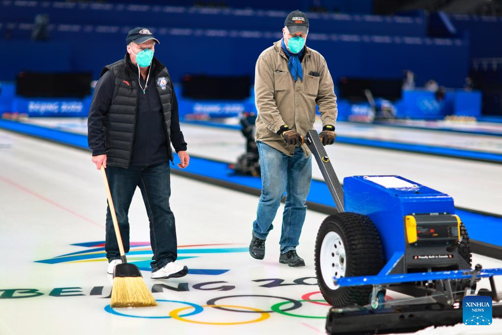 Hans Wuthrich (L) instructs ice-making work at the National Aquatics Center in Beijng, capital of China, Jan. 28, 2022. Hans Wuthrich, a Canadian professional ice technician of World Curling Federation, has been working for world-class curling competitions for years. This is the fourth Olympics for Wuthrich to work as a chief ice technician, responsible for ice-making work of four curling lanes in China's National Aquatics Center, also known as the Ice Cube. (Xinhua/Liu Xu)