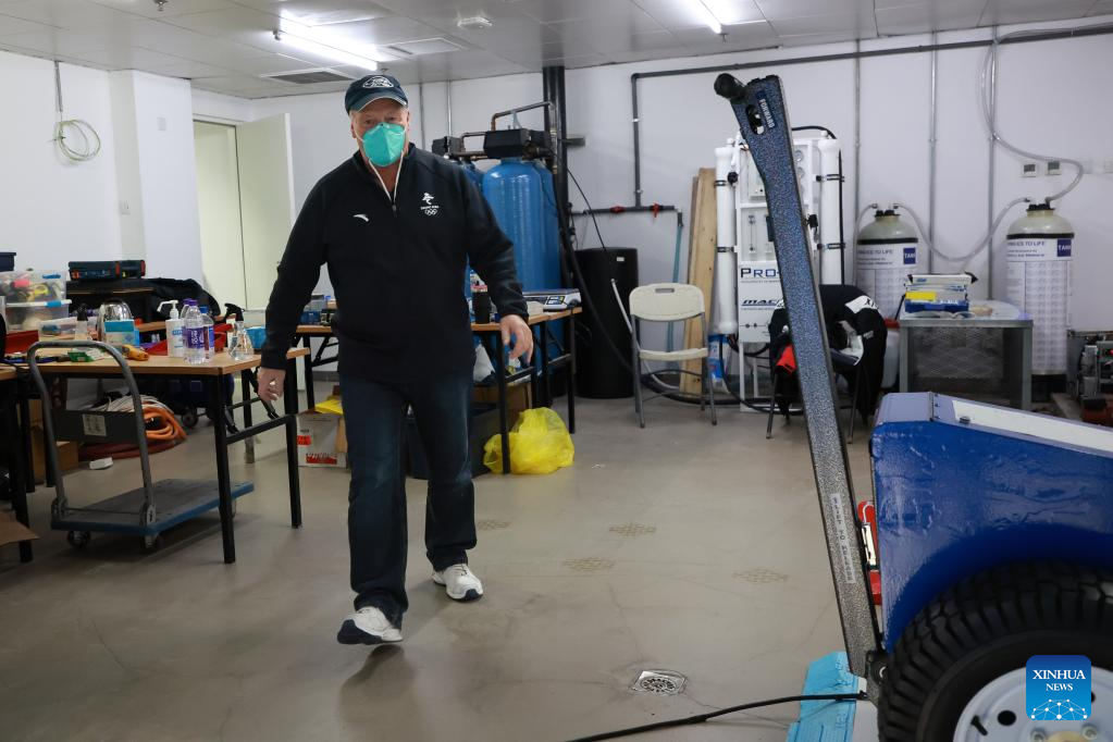 Hans Wuthrich works at an ice-making workshop of the National Aquatics Center in Beijng, capital of China, Jan. 28, 2022. Hans Wuthrich, a Canadian professional ice technician of World Curling Federation, has been working for world-class curling competitions for years. This is the fourth Olympics for Wuthrich to work as a chief ice technician, responsible for ice-making work of four curling lanes in China's National Aquatics Center, also known as the Ice Cube. (Xinhua/Liu Xu)