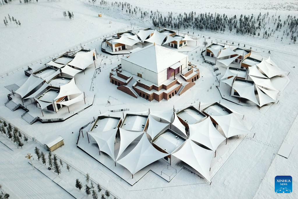 Aerial photo taken on Jan. 28, 2022 shows snow-covered tents in Hezuo City in Gannan Tibetan Autonomous Prefecture, northwest China's Gansu Province. (Xinhua/Fan Peishen)