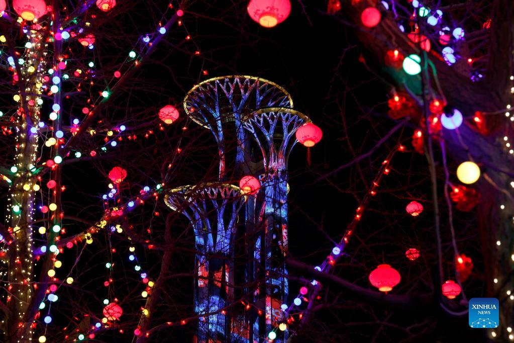 Photo taken on Jan. 29, 2022 shows a light show at the Beijing Olympic Tower in Beijing, capital of China. (Xinhua/Ding Xu)