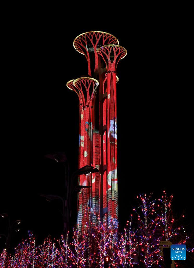 Photo taken on Jan. 29, 2022 shows a light show at the Beijing Olympic Tower in Beijing, capital of China. (Xinhua/Ding Xu)