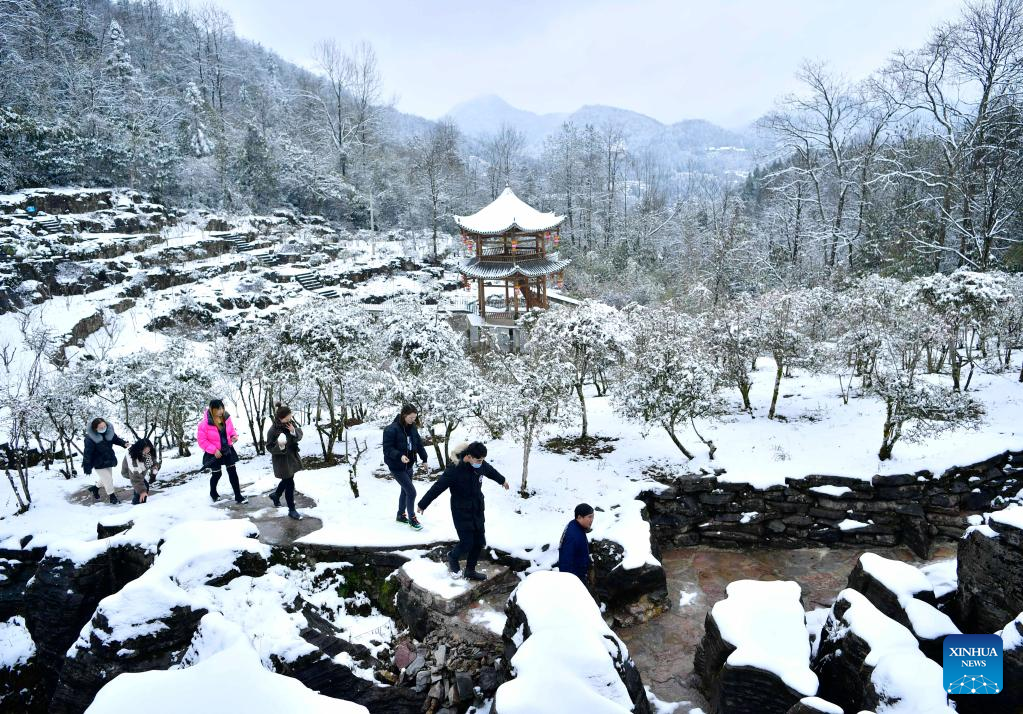 Visitors play in the snow at a park in Xuanen County, central China's Hubei Province, Jan. 29, 2022. (Photo by Song Wen/Xinhua)