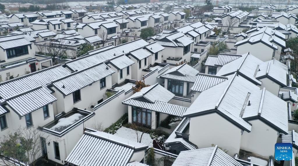 Aerial photo taken on Jan. 29, 2022 shows snow-covered houses in Deqing County of Huzhou, east China's Zhejiang Province. (Photo by Xie Shangguo/Xinhua)