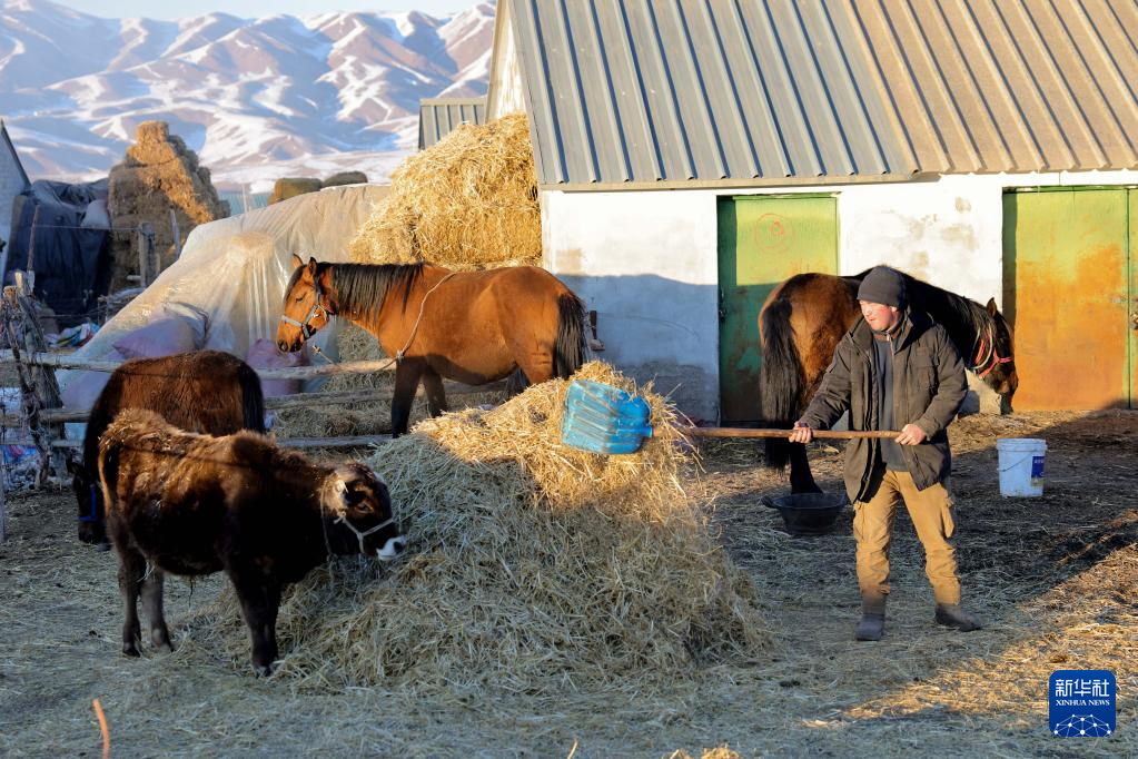 A herdsman piles hay in Karadala Township of Tekes County, northwest China's Xinjiang Uygur Autonomous Region, Jan. 27, 2022. Herdsmen in Xinjiang had lived a nomadic life for centuries. Under a housing project to benefit hundreds of households of local herdsmen, local authorities have initiated construction of supporting facilities to help herdsmen's settlement. It helps herdsmen to start a new life with better medical, educational, cultural and health facilities. (Xinhua/Ding Lei)