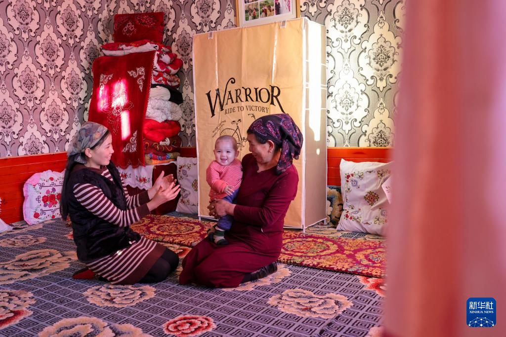 Women take care of their baby at home in Karadala Township of Tekes County, northwest China's Xinjiang Uygur Autonomous Region, Jan. 27, 2022. Herdsmen in Xinjiang had lived a nomadic life for centuries. Under a housing project to benefit hundreds of households of local herdsmen, local authorities have initiated construction of supporting facilities to help herdsmen's settlement. It helps herdsmen to start a new life with better medical, educational, cultural and health facilities. (Xinhua/Ding Lei)