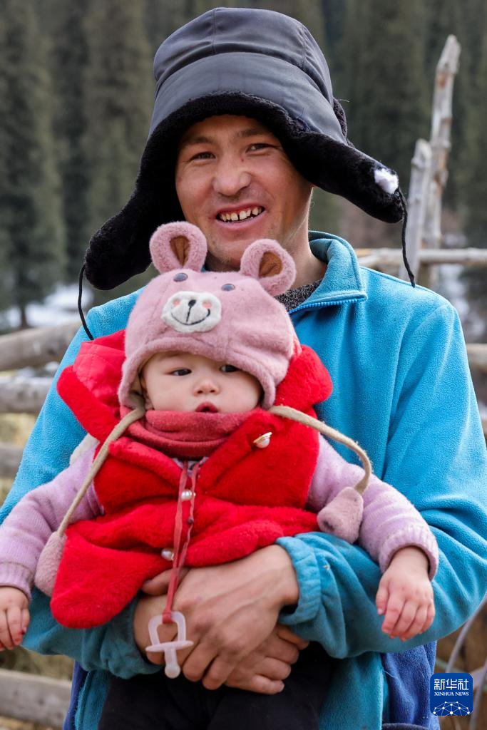 A herdsman and his child pose for a photo at the Akyaz Valley in Zhaosu County, northwest China's Xinjiang Uygur Autonomous Region, Jan. 26, 2022. Herdsmen in Xinjiang had lived a nomadic life for centuries. Under a housing project to benefit hundreds of households of local herdsmen, local authorities have initiated construction of supporting facilities to help herdsmen's settlement. It helps herdsmen to start a new life with better medical, educational, cultural and health facilities. (Xinhua/Ding Lei)