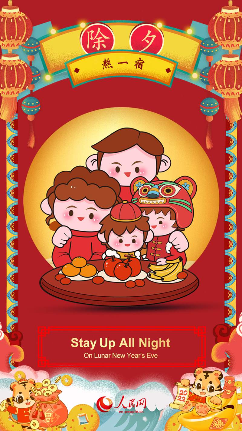 According to folklore, the reason why people stay up all night on Chinese New Year's Eve is that they have to try to drive away a monster called Nian (year). The monster was believed to hurt people in villages during the eve of the new year.