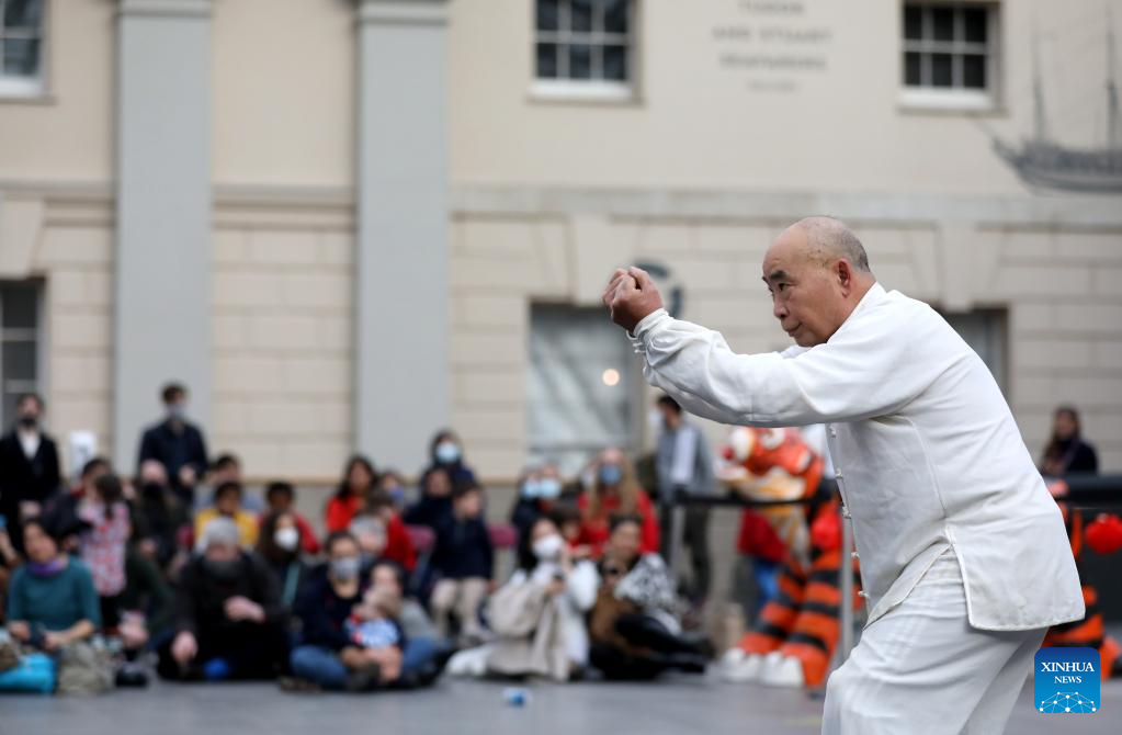 A man demonstrates Chinese martial arts during a Chinese Lunar New Year celebration held in National Maritime Museum in London, Britain, Jan. 29, 2022. (Xinhua/Li Ying)