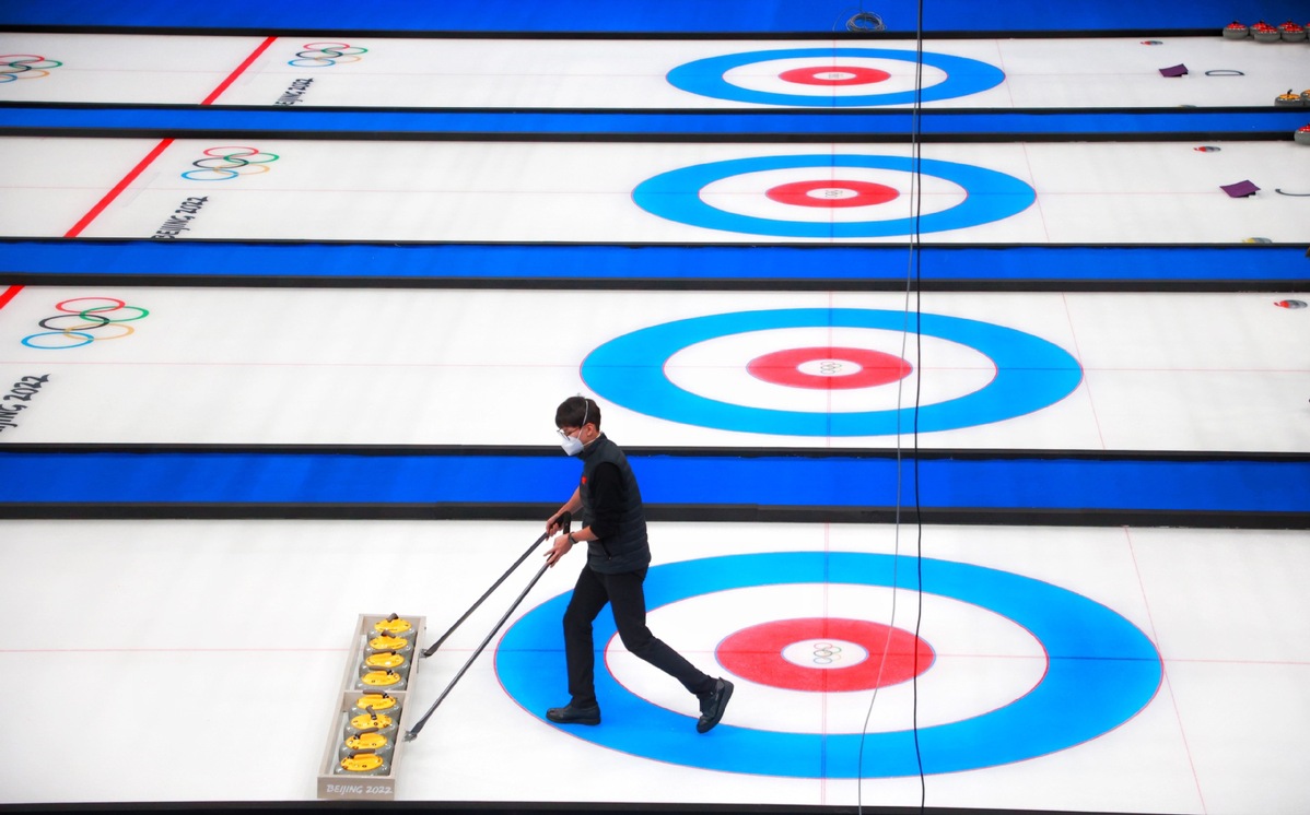A worker prepares for the upcoming curling competition for the Beijing 2022 Winter Olympics, at the National Aquatics Center, known as the "Ice Cube", in Beijing, Jan 26, 2022. [Photo/Xinhua]