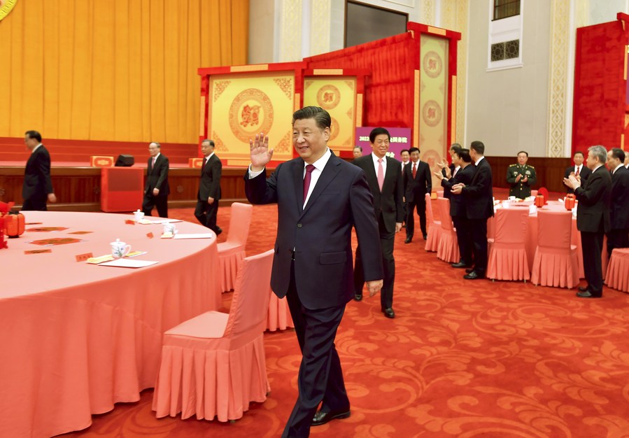 Chinese President Xi Jinping, also general secretary of the Communist Party of China (CPC) Central Committee and chairman of the Central Military Commission, waves as he attends a Chinese Lunar New Year reception at the Great Hall of the People in Beijing, capital of China, Jan. 30, 2022. (Xinhua/Li Tao)