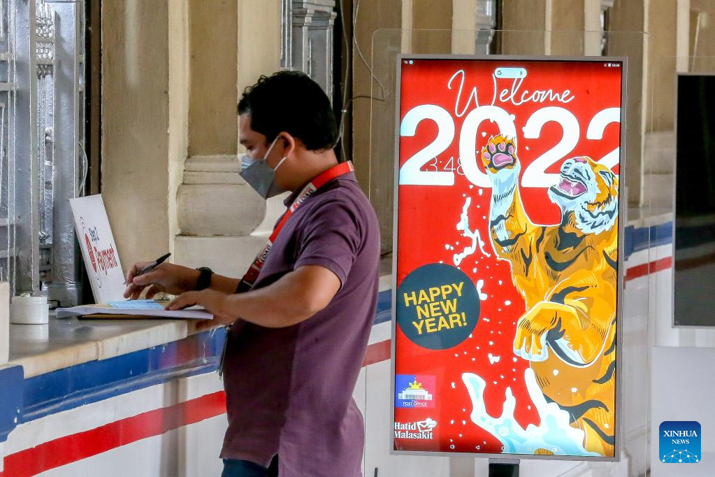 A display showing a publicity image of the newly-launched commemorative "Year of the Tiger" special stamps is seen at a branch office of the Philippine Postal Corporation (PHLPost) in Manila, the Philippines, on Jan. 31, 2022. The PHLPost launched on Monday commemorative "Year of the Tiger" special stamps to celebrate the upcoming Chinese New Year. (Xinhua/Rouelle Umali)