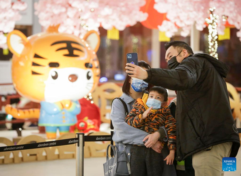 People take photos in front of Chinese Lunar New Year decorations at a shopping mall in Vancouver, British Columbia, Canada, on Jan. 30, 2022. The upcoming Chinese Lunar New Year, the Year of the Tiger, falls on Feb. 1 this year. (Photo by Liang Sen/Xinhua)