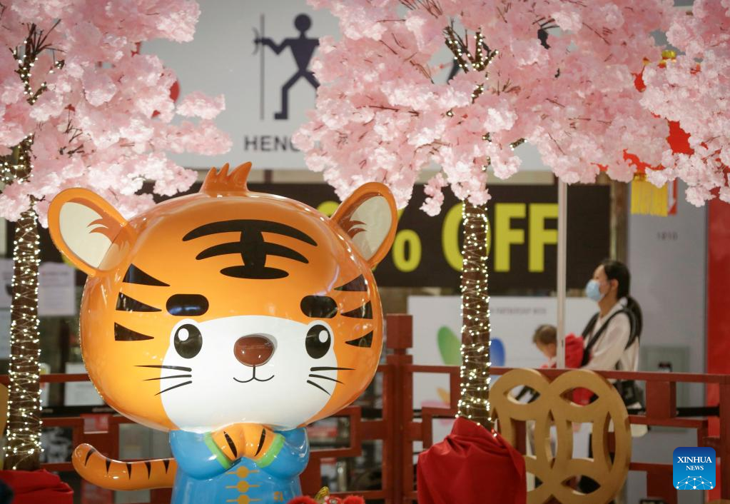 A giant tiger model is displayed at a shopping mall to welcome the upcoming Chines Lunar New Year in Vancouver, British Columbia, Canada, on Jan. 30, 2022. The upcoming Chinese Lunar New Year, the Year of the Tiger, falls on Feb. 1 this year. (Photo by Liang Sen/Xinhua)