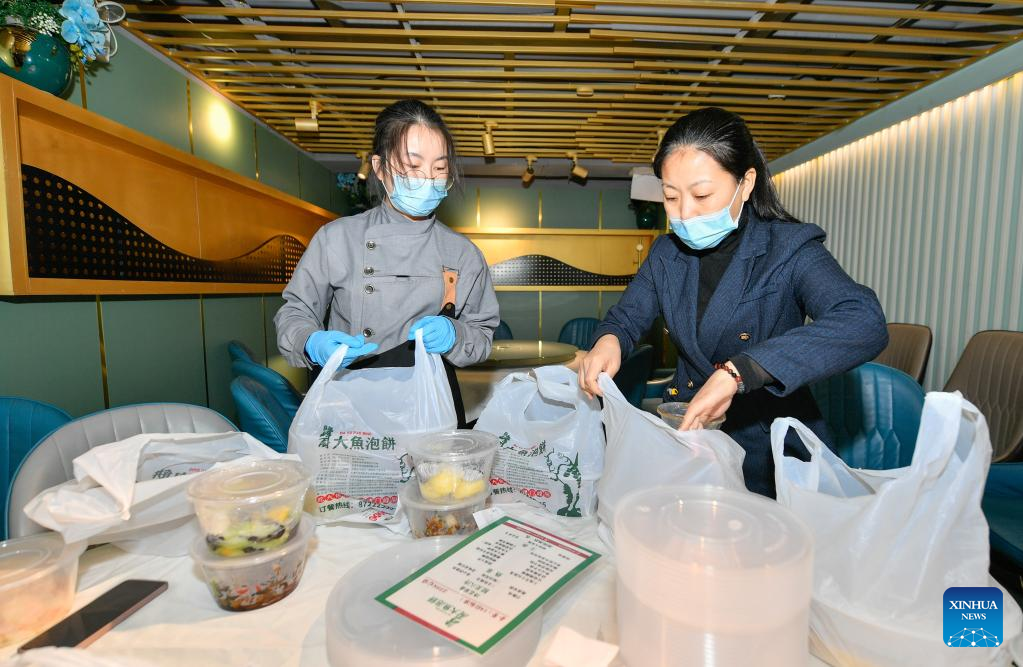 A waiter packs customers' pre-ordered meals at a restaurant in Nankai District, north China's Tianjin, Jan. 31, 2022. In areas classified as low risk for COVID-19 in Tianjin, some restaurants have introduced takeout service for the holiday feasts. The service not only satisfies customers' demand but also can help to prevent the spread of COVID-19.