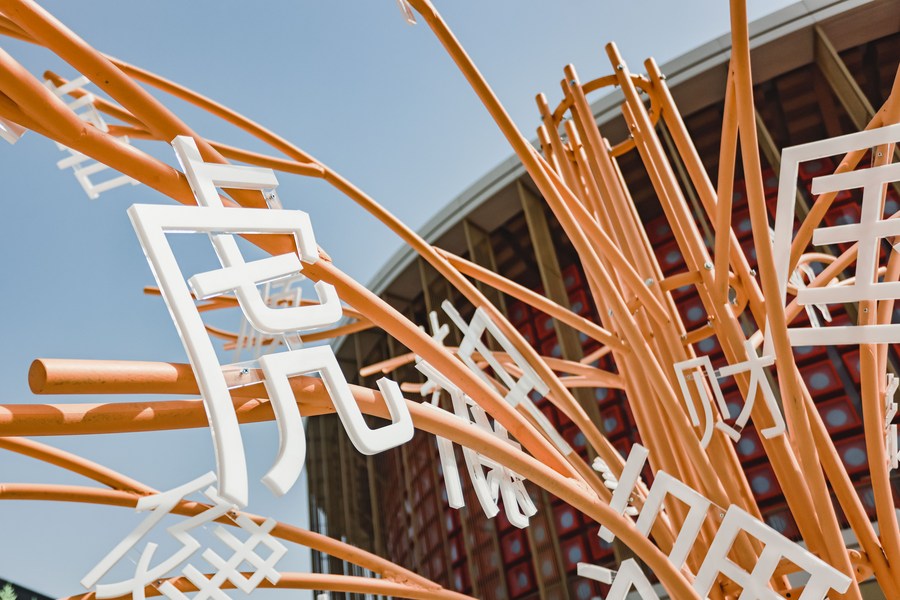 Photo taken on Jan. 31, 2022 shows various Chinese characters on the "tree of Chinese characters" outside the China Pavilion at the Expo 2020 Dubai in Dubai, the United Arab Emirates. (Xinhua)