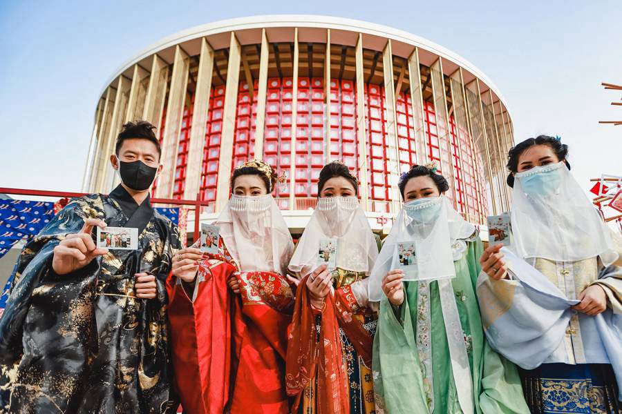 People wearing ancient Chinese costumes pose for a group photo in front of the China Pavilion at the Expo 2020 Dubai in Dubai, the United Arab Emirates, on Jan. 31, 2022. (Xinhua)