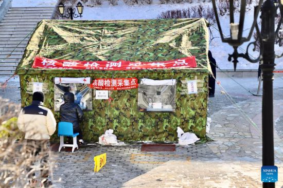A medical worker takes a swab sample from a citizen for nucleic acid test at a testing site in Suifenhe, northeast China's Heilongjiang Province, Jan. 31, 2022. To stem a new wave of COVID-19 resurgence, people from different walks in Suifenhe stick to their post and fight against the epidemic as the Spring Festival holiday approaches. (Xinhua/Xu Kaixin)