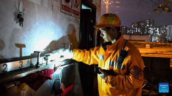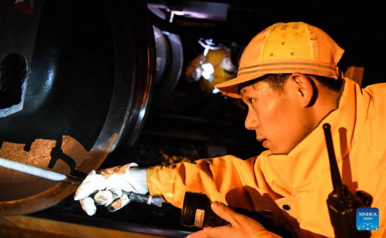 A staff member checks a freight train at a railway station in Liuzhou, south China's Guagnxi Zhuang Autonomous Region, Jan. 31, 2022. On the eve of the Chinese Lunar New Year, staff members at the railway station stuck to their posts to ensure the safe operation of the trains. (Xinhua/Zhang Ailin)