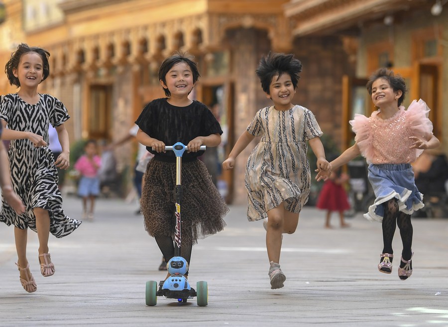 Children have fun in "Dove Lane" in the old town Tuancheng of Hotan City, northwest China's Xinjiang Uygur Autonomous Region, May 27, 2020. (Xinhua/Shadati)