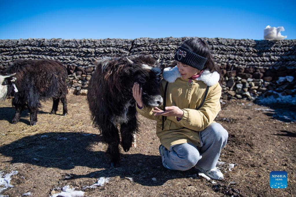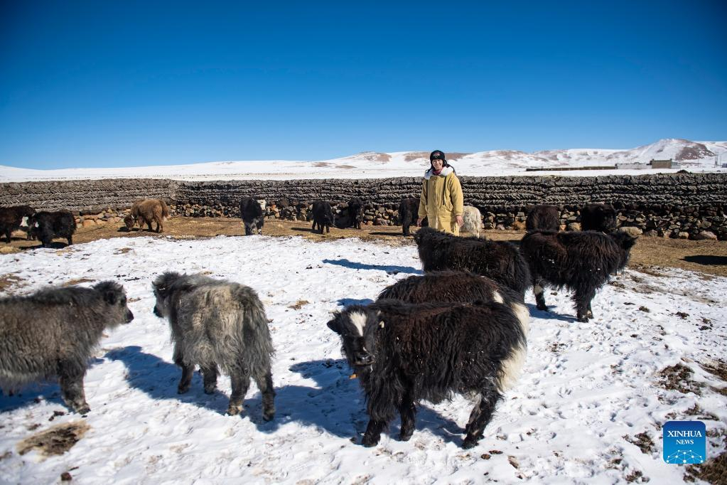 Tenzin Drolma stands inside a pen in Gyaga Village of Damxung County, southwest China's Tibet Autonomous Region, Jan. 18, 2022. Tenzin Drolma, 21, was born on the grassland near Lake Namtso in Tibet. In 2020, she was admitted to Jiangsu Food and Pharmaceutical Science College in east China's Jiangsu Province as a Chinese pharmacy major student. The college life in the outside world is fresh to Drolma. She met many new classmates and made many friends. When winter vacation came, Drolma returned to her beloved home. "I leave my hometown in order to come back being a better person," she said. "I hope that when I graduate from college, I can help my family live a better life and I can be a useful person to my hometown and people here." (Xinhua/Sun Ruibo)