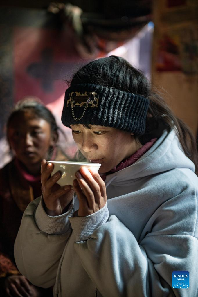 Tenzin Drolma drinks fresh milk in Gyaga Village of Damxung County, southwest China's Tibet Autonomous Region, Jan. 18, 2022. Tenzin Drolma, 21, was born on the grassland near Lake Namtso in Tibet. In 2020, she was admitted to Jiangsu Food and Pharmaceutical Science College in east China's Jiangsu Province as a Chinese pharmacy major student. The college life in the outside world is fresh to Drolma. She met many new classmates and made many friends. When winter vacation came, Drolma returned to her beloved home. "I leave my hometown in order to come back being a better person," she said. "I hope that when I graduate from college, I can help my family live a better life and I can be a useful person to my hometown and people here." (Xinhua/Sun Ruibo)