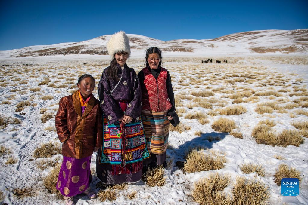 Tenzin Drolma (C) stands with her mother (R) and a neighbor girl while herding cattle in Gyaga Village of Damxung County, southwest China's Tibet Autonomous Region, Jan. 18, 2022. Tenzin Drolma, 21, was born on the grassland near Lake Namtso in Tibet. In 2020, she was admitted to Jiangsu Food and Pharmaceutical Science College in east China's Jiangsu Province as a Chinese pharmacy major student. The college life in the outside world is fresh to Drolma. She met many new classmates and made many friends. When winter vacation came, Drolma returned to her beloved home. "I leave my hometown in order to come back being a better person," she said. "I hope that when I graduate from college, I can help my family live a better life and I can be a useful person to my hometown and people here." (Xinhua/Sun Ruibo)