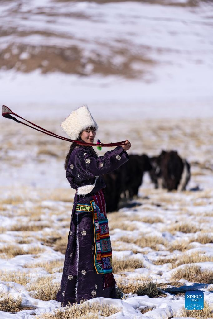 Tenzin Drolma herds cattle in Gyaga Village of Damxung County, southwest China's Tibet Autonomous Region, Jan. 18, 2022. Tenzin Drolma, 21, was born on the grassland near Lake Namtso in Tibet. In 2020, she was admitted to Jiangsu Food and Pharmaceutical Science College in east China's Jiangsu Province as a Chinese pharmacy major student. The college life in the outside world is fresh to Drolma. She met many new classmates and made many friends. When winter vacation came, Drolma returned to her beloved home. "I leave my hometown in order to come back being a better person," she said. "I hope that when I graduate from college, I can help my family live a better life and I can be a useful person to my hometown and people here." (Xinhua/Sun Ruibo)