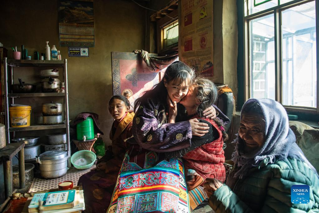 Tenzin Drolma (L) greets her grandmother in Gyaga Village of Damxung County, southwest China's Tibet Autonomous Region, Jan. 18, 2022. Tenzin Drolma, 21, was born on the grassland near Lake Namtso in Tibet. In 2020, she was admitted to Jiangsu Food and Pharmaceutical Science College in east China's Jiangsu Province as a Chinese pharmacy major student. The college life in the outside world is fresh to Drolma. She met many new classmates and made many friends. When winter vacation came, Drolma returned to her beloved home. "I leave my hometown in order to come back being a better person," she said. "I hope that when I graduate from college, I can help my family live a better life and I can be a useful person to my hometown and people here." (Xinhua/Sun Ruibo)