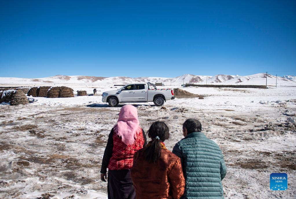 Tenzin Drolma's family welcomes her home in Gyaga Village of Damxung County, southwest China's Tibet Autonomous Region, Jan. 18, 2022. Tenzin Drolma, 21, was born on the grassland near Lake Namtso in Tibet. In 2020, she was admitted to Jiangsu Food and Pharmaceutical Science College in east China's Jiangsu Province as a Chinese pharmacy major student. The college life in the outside world is fresh to Drolma. She met many new classmates and made many friends. When winter vacation came, Drolma returned to her beloved home. "I leave my hometown in order to come back being a better person," she said. "I hope that when I graduate from college, I can help my family live a better life and I can be a useful person to my hometown and people here." (Xinhua/Sun Ruibo)