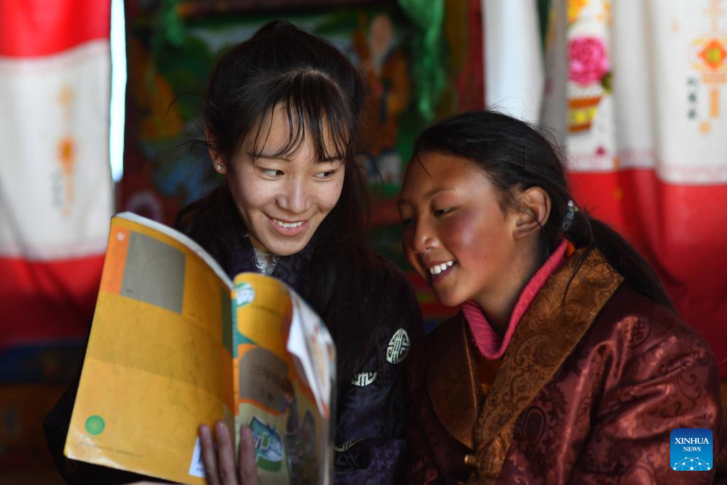 Tenzin Drolma (L) teaches a neighbor girl English at home in Gyaga Village of Damxung County, southwest China's Tibet Autonomous Region, Jan. 18, 2022. Tenzin Drolma, 21, was born on the grassland near Lake Namtso in Tibet.