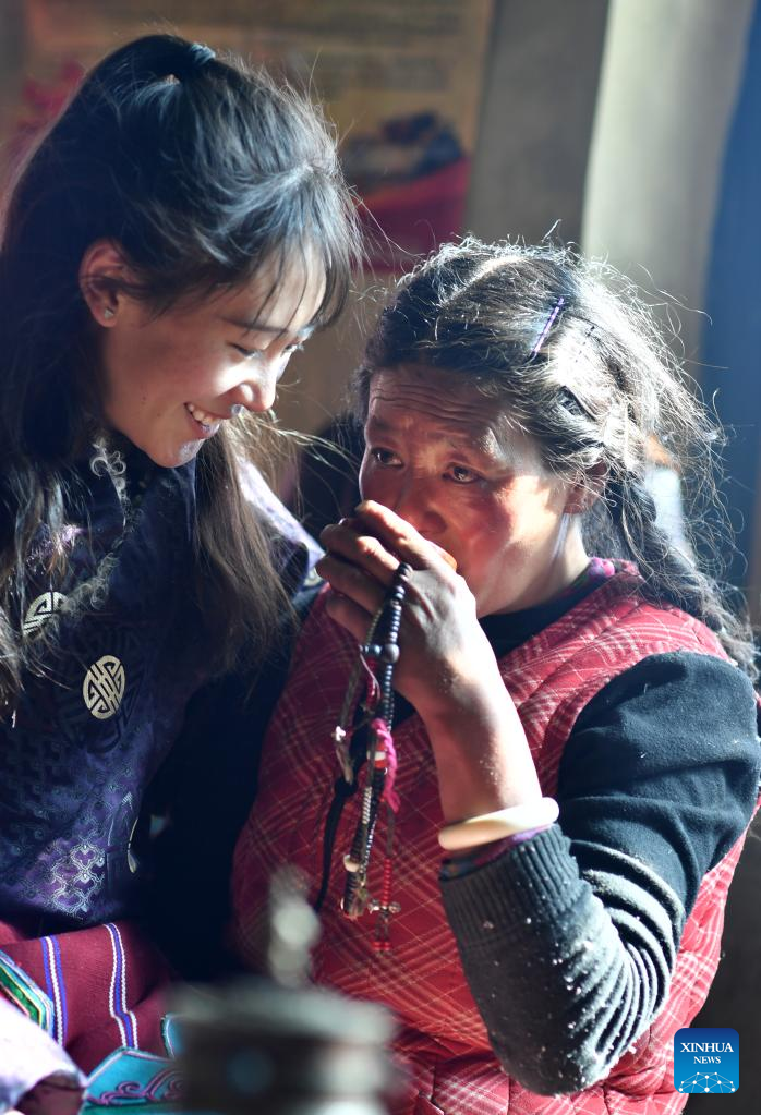 Tenzin Drolma (L) hands a cup of buttered tea to her mother at home in Gyaga Village of Damxung County, southwest China's Tibet Autonomous Region, Jan. 18, 2022. Tenzin Drolma, 21, was born on the grassland near Lake Namtso in Tibet.