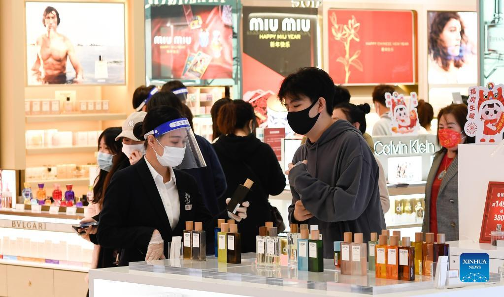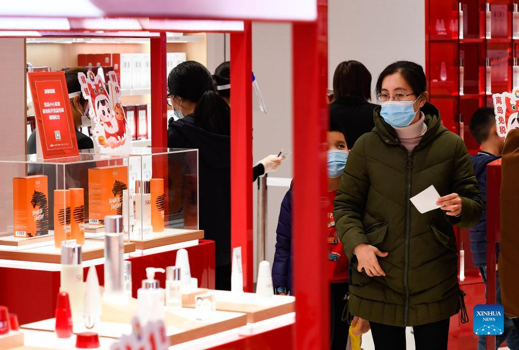 Customers select cosmetics in a duty-free shop in Haikou, capital of south China's Hainan Province, Feb. 3, 2022. (Xinhua/Yang Guanyu)