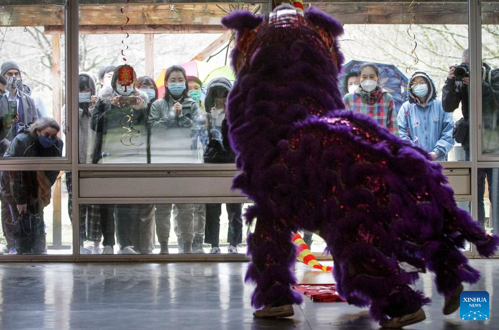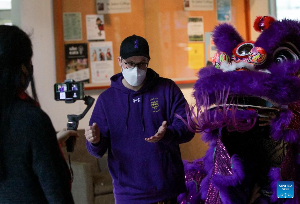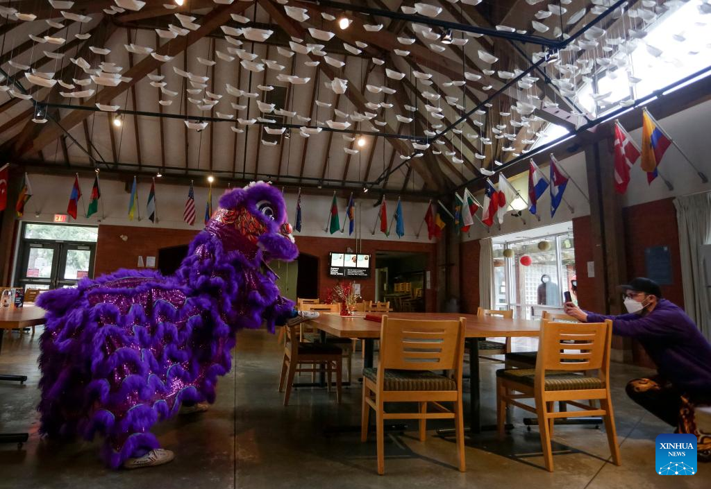 Lion dance performers demonstrate in front of a camera during an event at St. John's College, the University of British Columbia, in Vancouver, British Columbia, Canada, on Feb. 3, 2022. A lion dance was performed here on Thursday for people who may watch online or from outside through the windows, marking the Chinese New Year amid the COVID-19 pandemic. (Photo by Liang Sen/Xinhua)