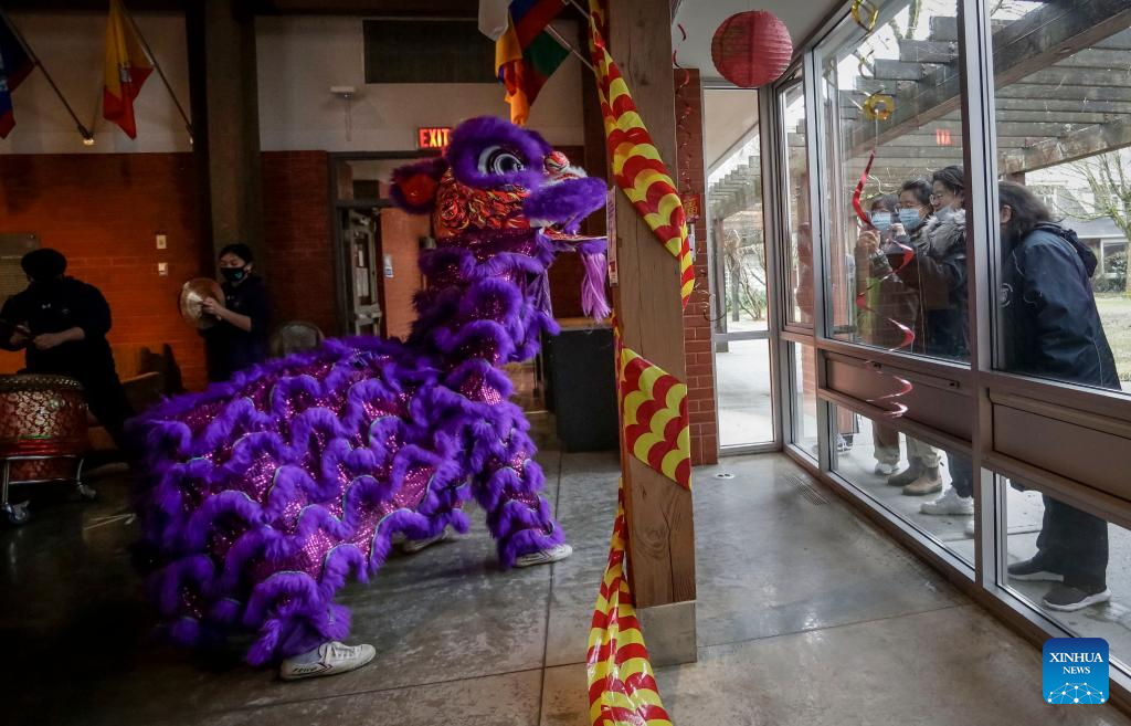 A man performs a lion dance at St. John's College, the University of British Columbia, in Vancouver, British Columbia, Canada, on Feb. 3, 2022. A lion dance was performed here on Thursday for people who may watch online or from outside through the windows, marking the Chinese New Year amid the COVID-19 pandemic. (Photo by Liang Sen/Xinhua)