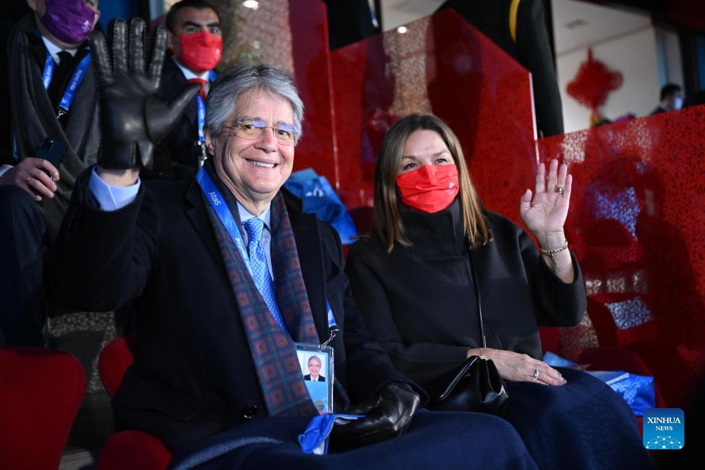 Ecuadorian President Guillermo Lasso and his wife wave during the opening ceremony of the 24th Olympic Winter Games at the National Stadium in Beijing, capital of China, Feb. 4, 2022. (Xinhua/Ma Ning)