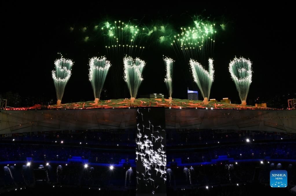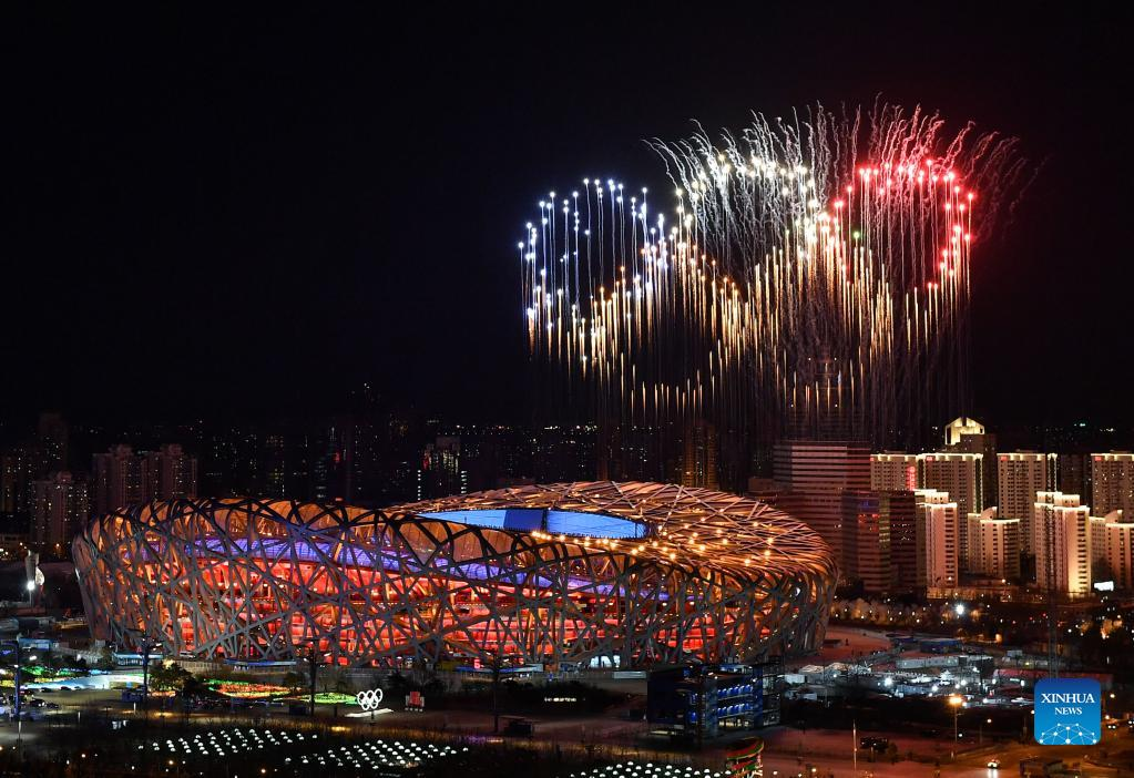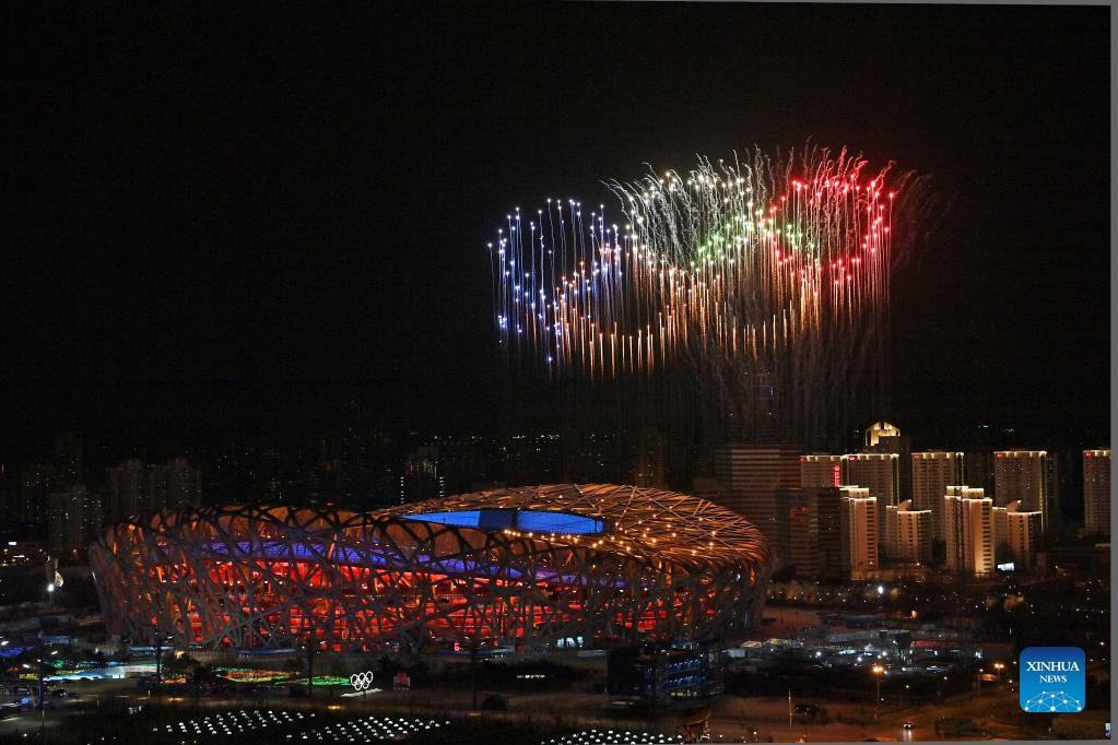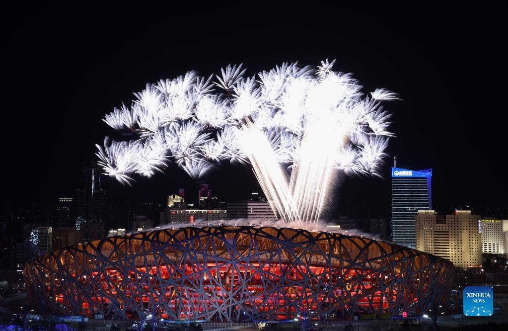 Fireworks illuminate the night sky during the opening ceremony of the Beijing 2022 Olympic Winter Games at the National Stadium in Beijing, capital of China, Feb. 4, 2022. (Xinhua/Ju Huanzong)