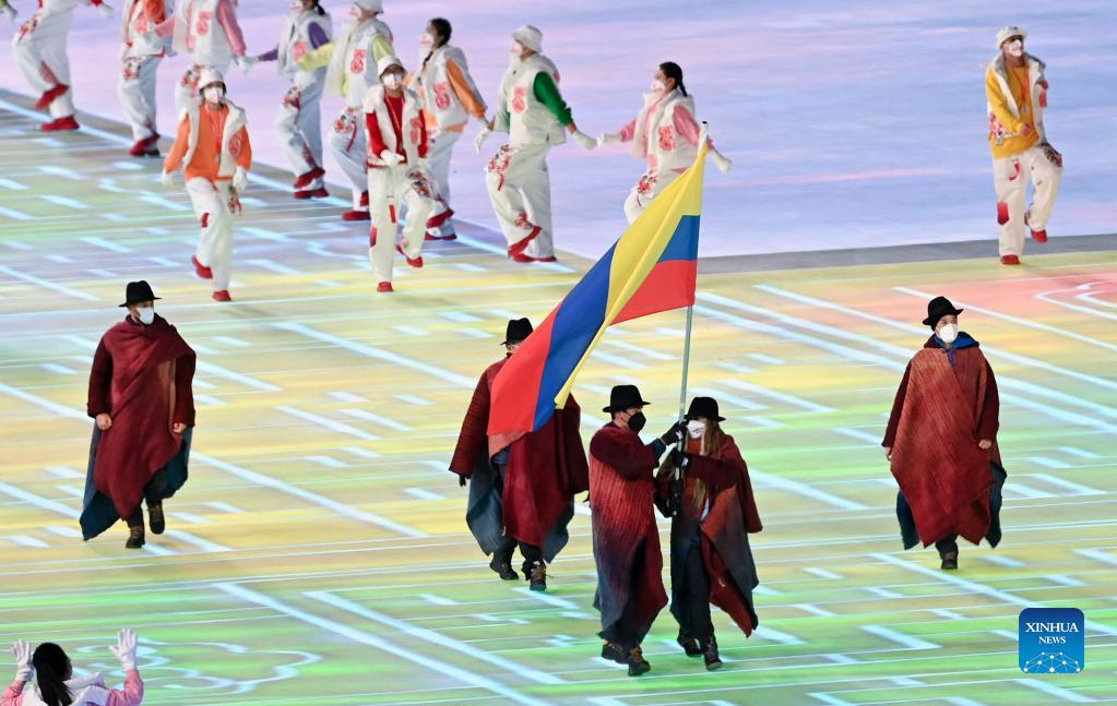 The Olympic delegation of Colombia parade into the National Stadium during the opening ceremony of the Beijing 2022 Olympic Winter Games in Beijing, capital of China, Feb. 4, 2022. (Xinhua/Huang Zongzhi)