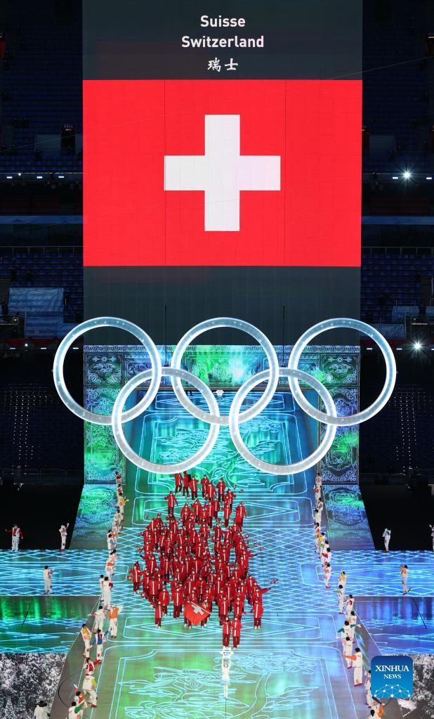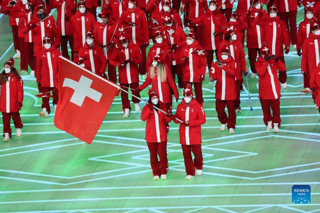 The Olympic delegation of Switzerland parade into the National Stadium during the opening ceremony of the Beijing 2022 Olympic Winter Games in Beijing, capital of China, Feb. 4, 2022. (Xinhua/Cao Can)