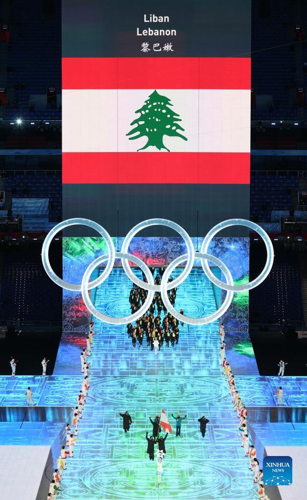 The Olympic delegation of Lebanon parade into the National Stadium during the opening ceremony of the Beijing 2022 Olympic Winter Games in Beijing, capital of China, Feb. 4, 2022. (Xinhua/Yang Lei)