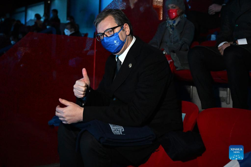Serbian President Aleksandar Vucic gives the thumbs-up sign during the opening ceremony of the 24th Olympic Winter Games at the National Stadium in Beijing, capital of China, Feb. 4, 2022. (Xinhua/Ma Ning)