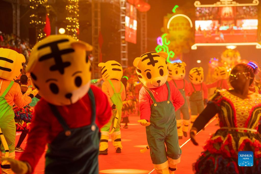 Artists perform during a parade to celebrate Chinese Lunar New Year in south China's Macao on Feb. 3, 2022. (Xinhua/Cheong Kam Ka)